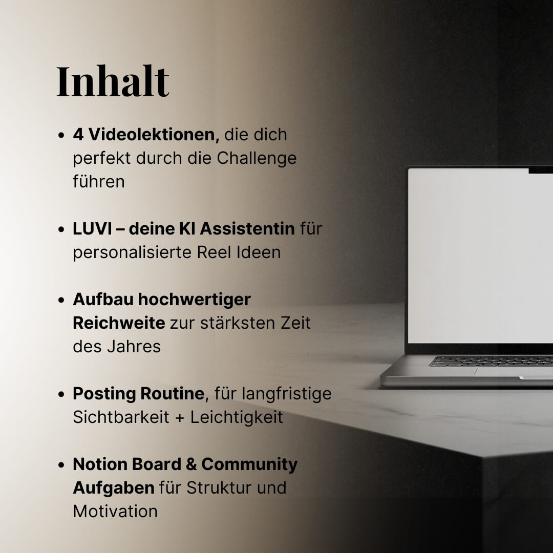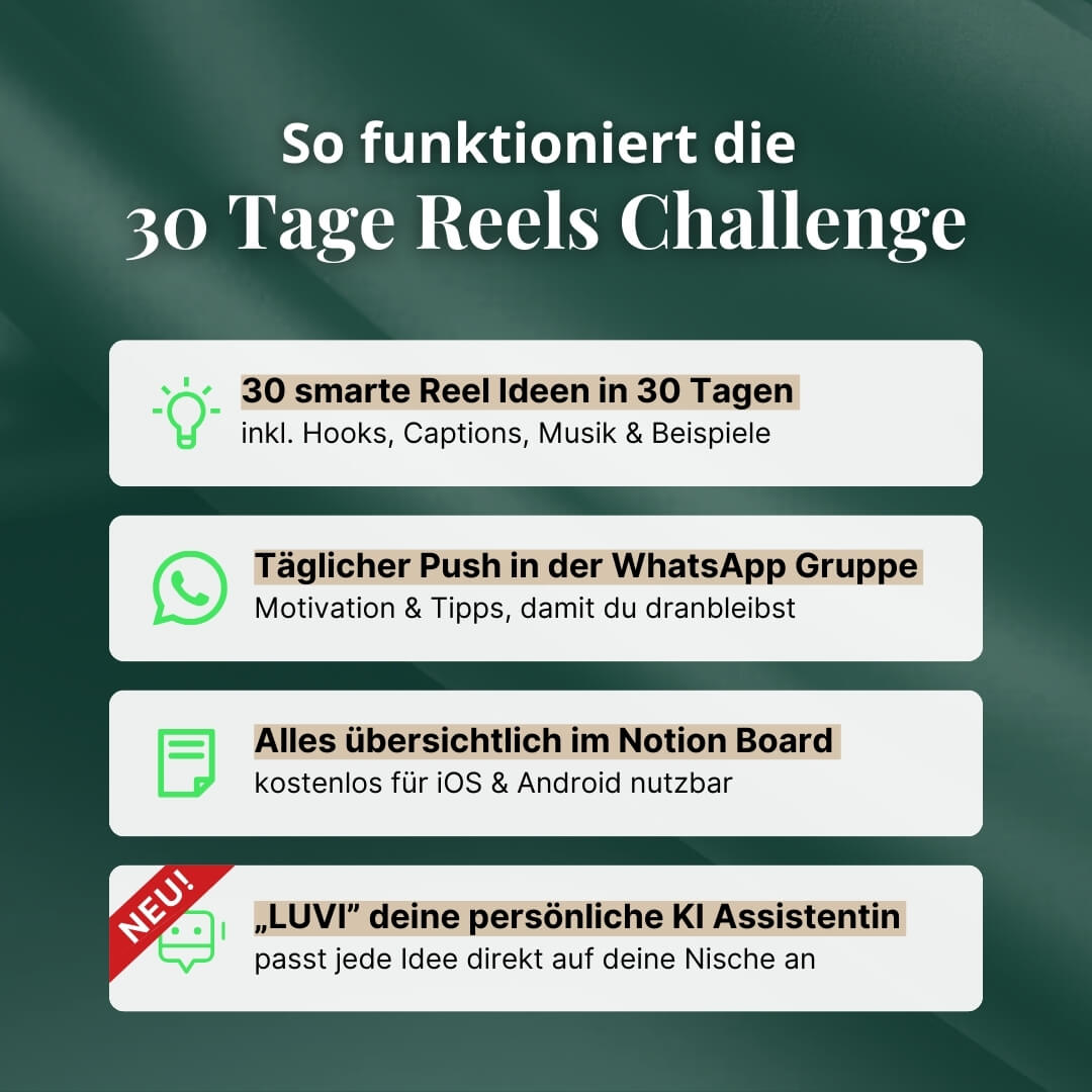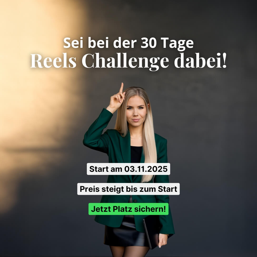 Du willst Reels posten, aber dir fehlt die Zeit für jeden Tag neue Ideen zu finden. Du kennst das Potenzial, doch die Planung zieht sich und die Motivation sinkt. Genau hier hilft dir meine Challenge!