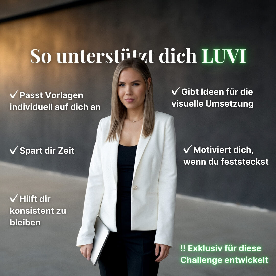 Das Herzstück ist LUVI. Deine persönliche KI Assistentin, von mir und meinem Partner Luci entwickelt. LUVI passt jede Idee präzise an deine Nische an. Keine langen Anpassungen mehr. Du kannst direkt starten.