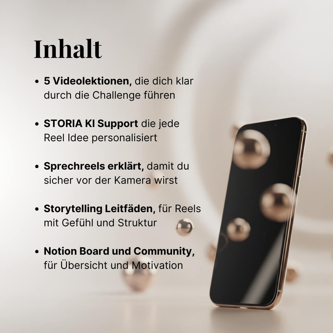 - 30 ausgearbeitete Storytelling Reel Ideen mit Hooks, Captions, Beispielen und lizenzfreier Musik